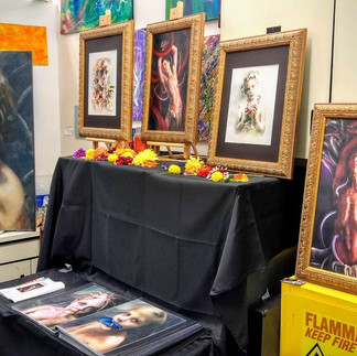 Some of what we had on display for our Artful Open Studios / Coventry Village Final Fridays for the CovenTREAT: Trick-or-Treat in Coventry Village! event (we handed out MANDEM art postcards as our treat — but don't worry, there were edible goodies provided by Artful Cleveland for those who wanted noms).