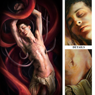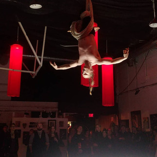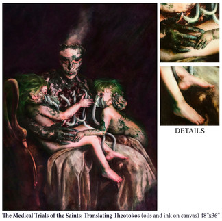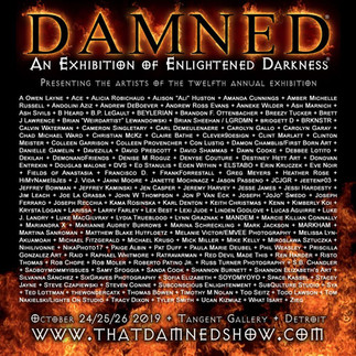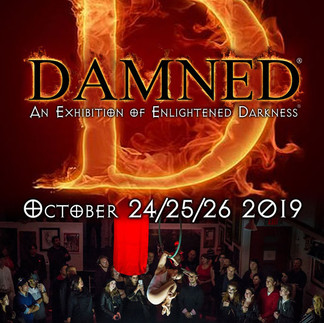 An image from the 12th annual DAMNED Exhibition of Enlightened Darkness (3 Nights) in Detroit, here showing a live performance by Jay from Detroit Circus. "The Medical Trials of the Saints: St. Sebastian, Paion" is in the middle of the wall on the right. We're sorry we can't be at the event in person, but October is so busy for us! Maybe next year.